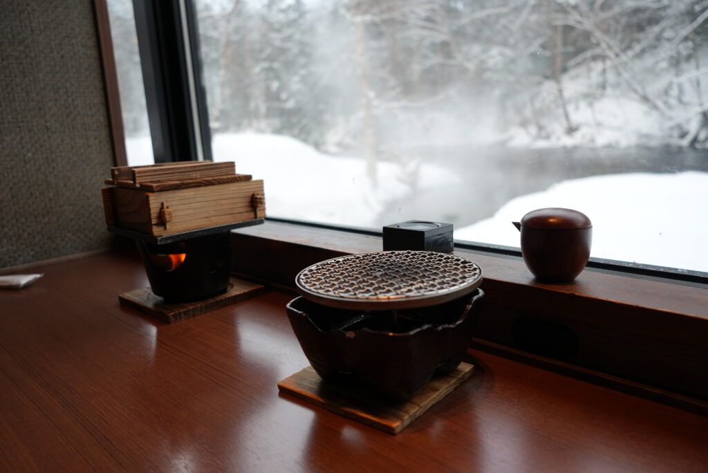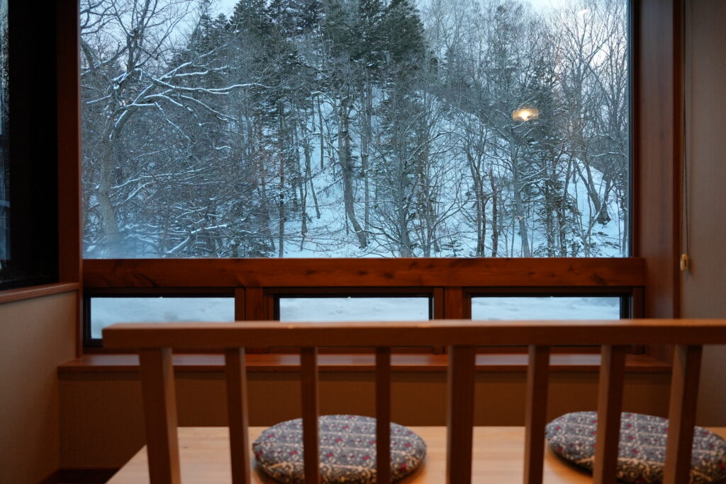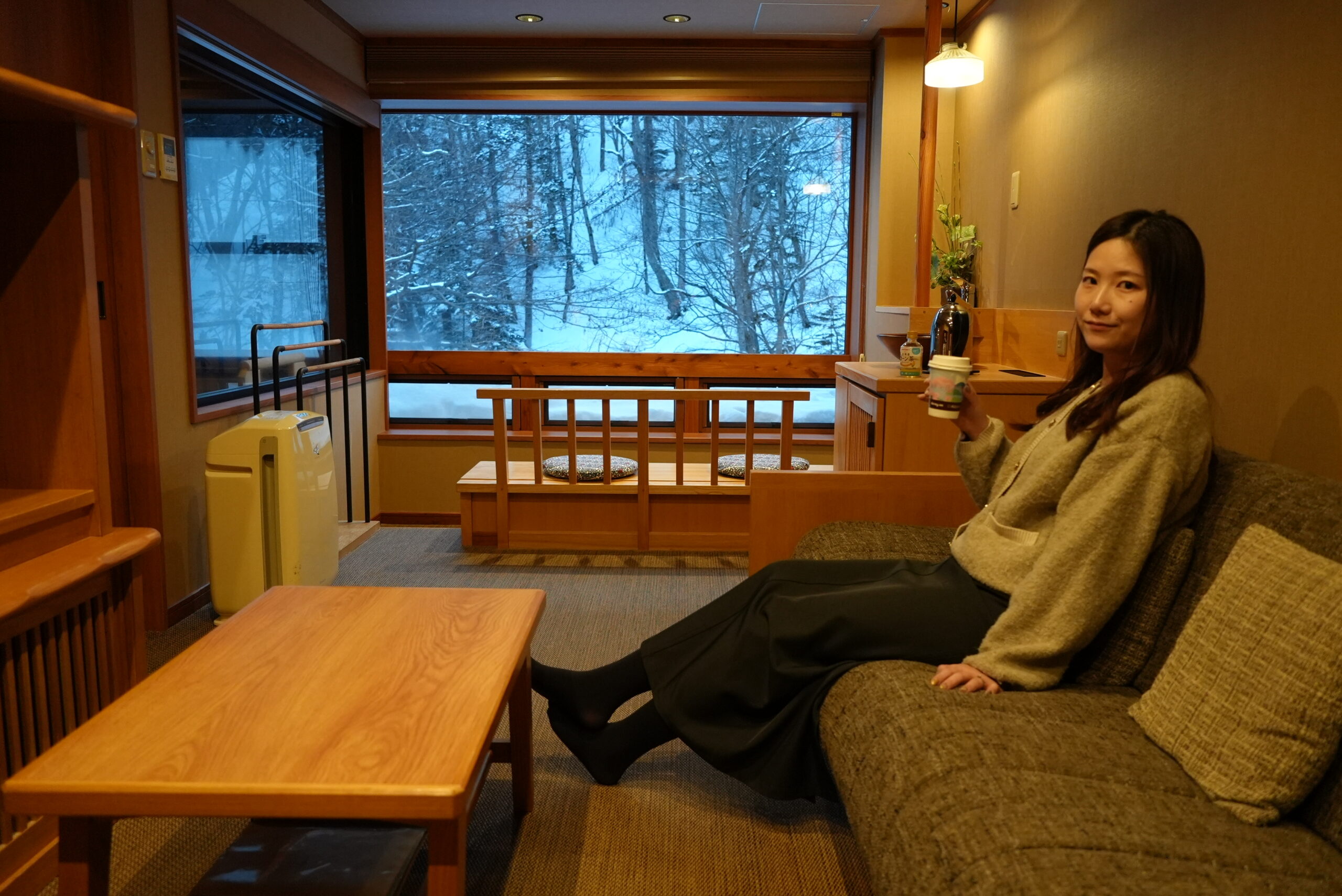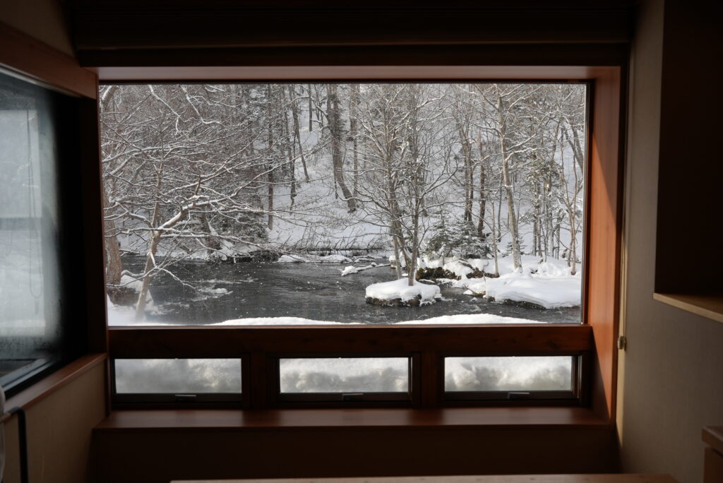 部屋に入った瞬間、 大きな窓の向こうに広がるのは、雪に包まれた阿寒川。