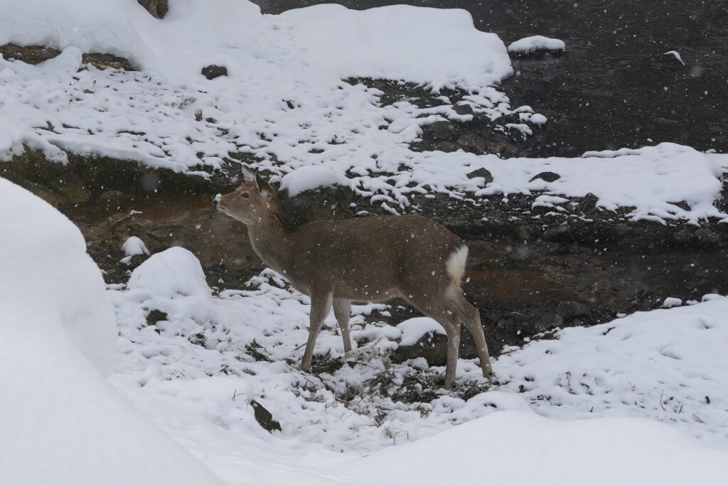 なんと、 部屋の窓の外、阿寒川沿いにエゾシカが現れました。