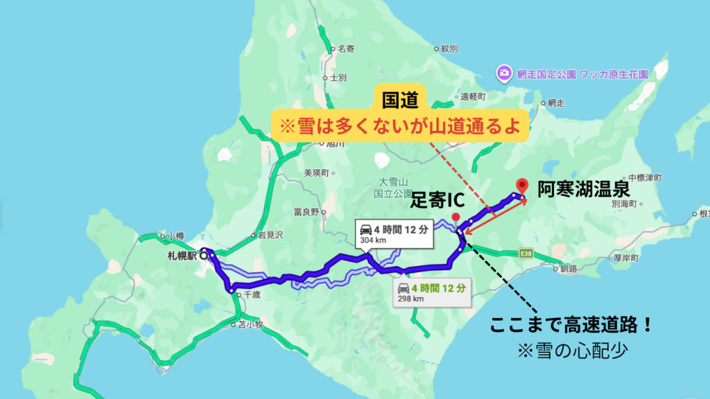 札幌 →(道東自動車道)→ 足寄IC →(一般道)→ 阿寒湖