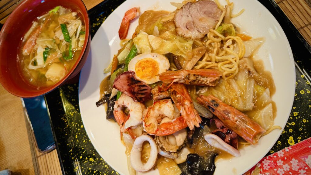 海鮮と北海道の野菜がたっぷり入った熱々のあんかけ焼きそば。
