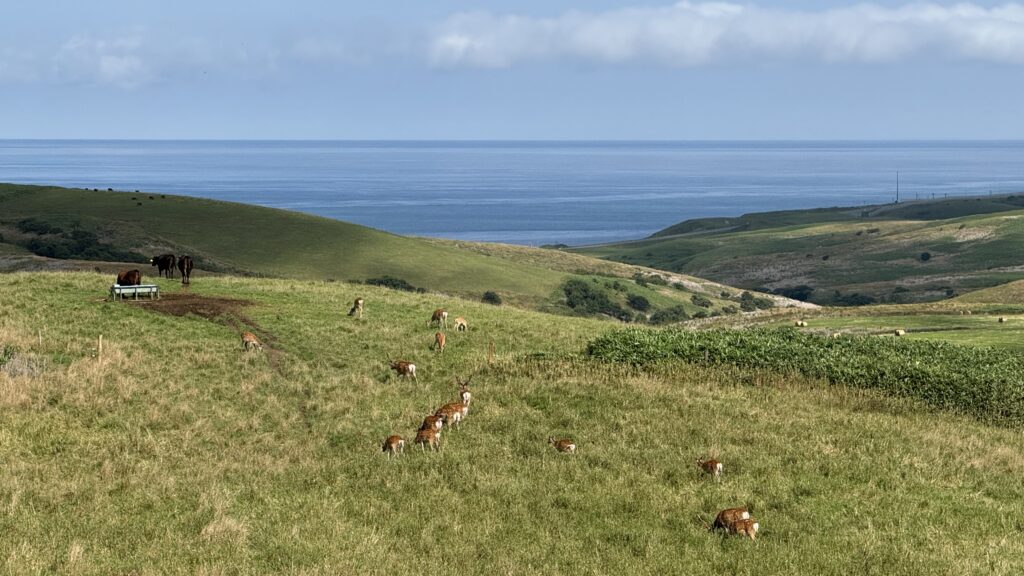 途中で鹿の群れが現れたり、牛がこちらをじっと見つめていたりして、