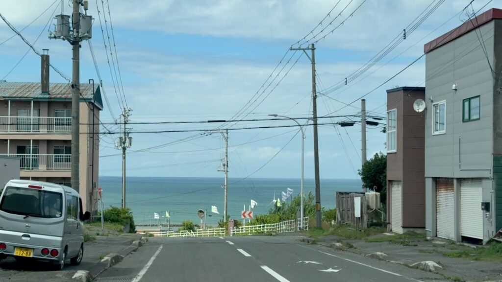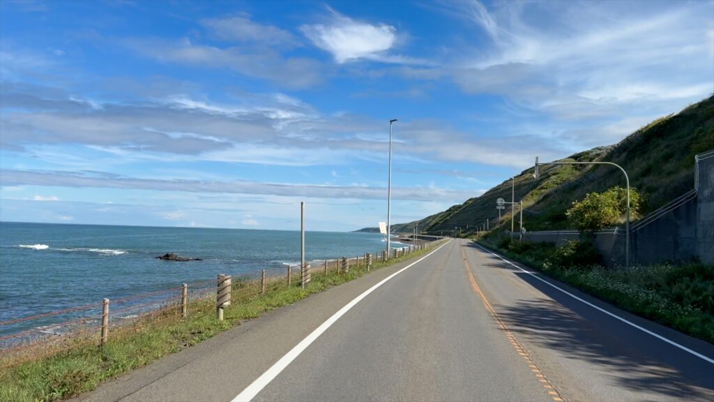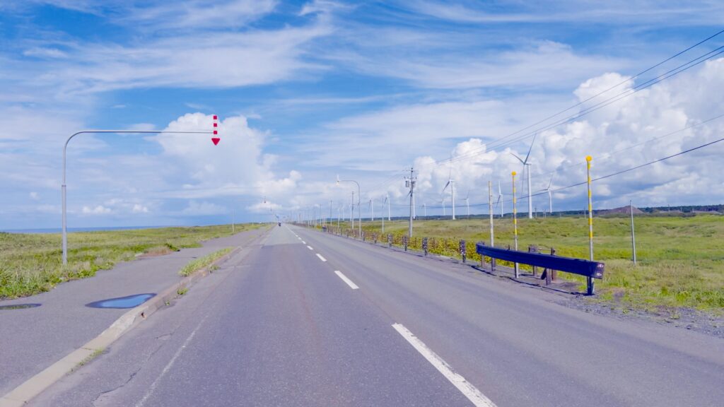 左手に海、右手に牧草地と風車が広がる、まさに“北海道らしさ”満点の道です。