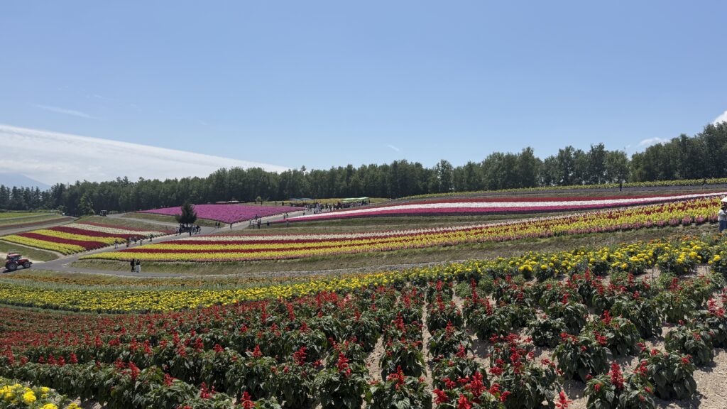 前回私が訪れた際、この景色に頭がお花畑になっていたこともあり、真夏にこの広さの花畑をじっくり1時間程度掛けて回りました。当然花畑に売店はないので、飲み物持参で散策しましょう!(花畑の外にはレストランや売店もあります)