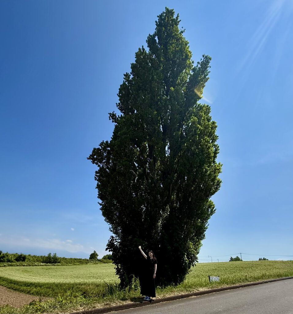 次に向かうのは「セブンスターの木」です。わかる人には分かると思いますが、タバコの”セブンスター”です。広大な丘陵が続く美瑛では、一本の木の風景がとても映えます。そのため、かつて好んで広告に使用されたとか。う〜ん、タバコの悪さを美しい景色で中和していると言われた方が納得できるなあ。