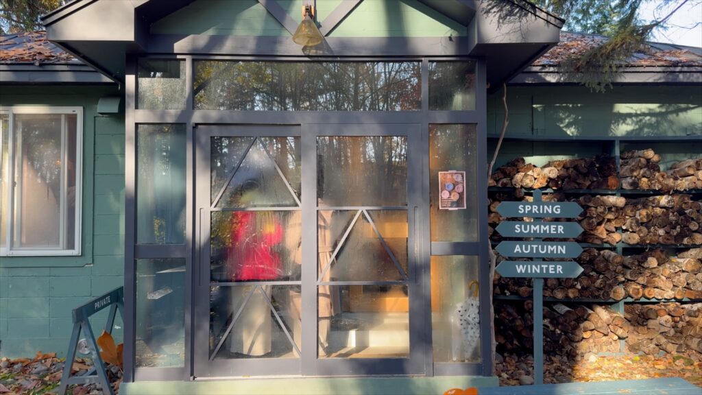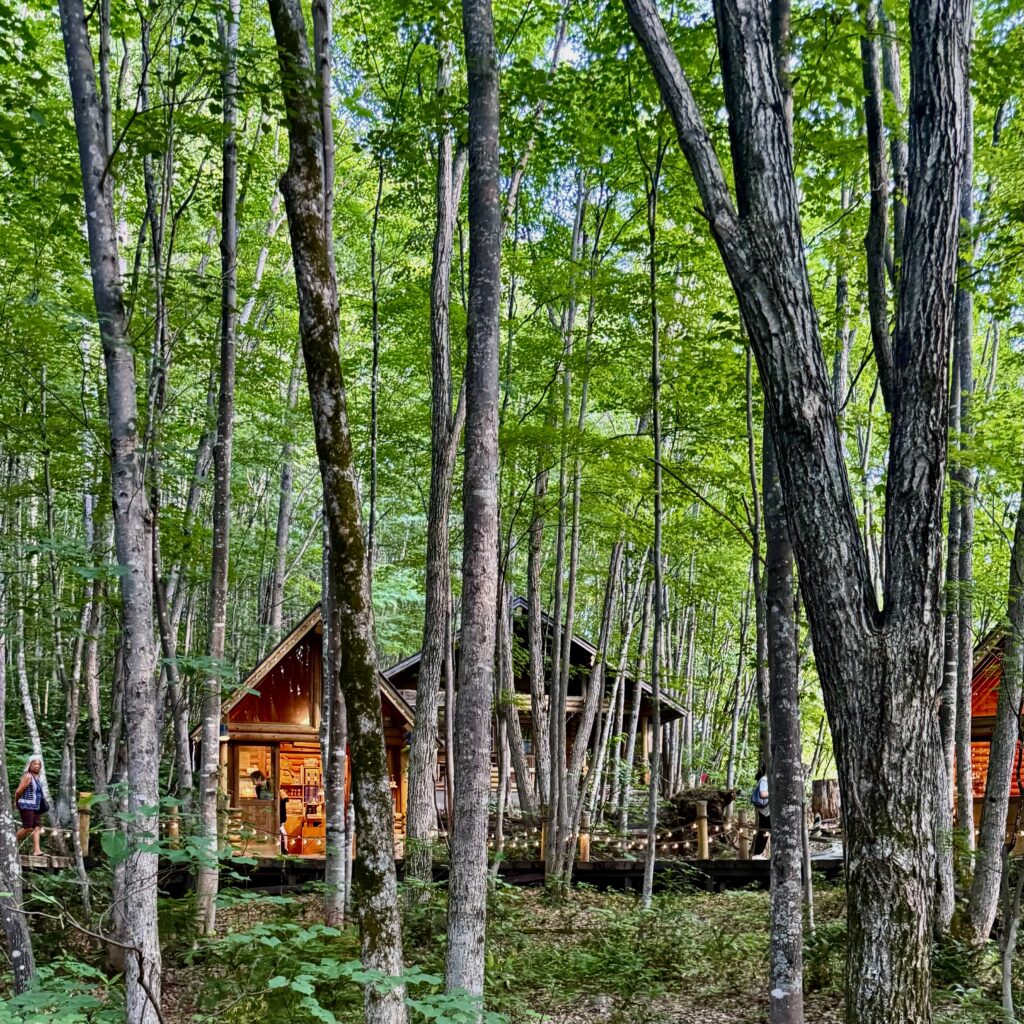 まるで絵本の世界に迷い込んだような小さなログハウスが連なり、妖精たちの秘密基地を思わせます。散策していると、まるで森の妖精がこっそり商売を始めたみたい。