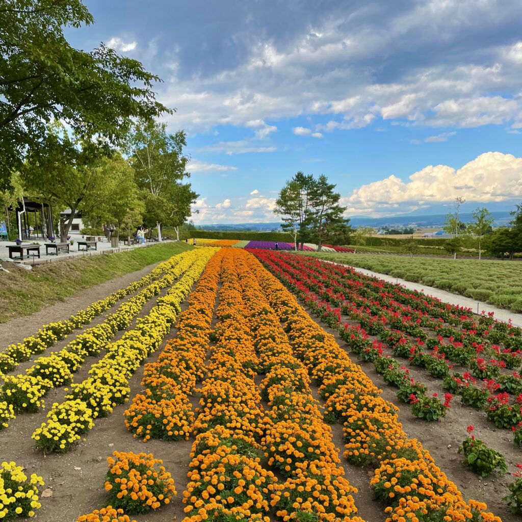 ここはもう絶景という言葉以外出てきません。美瑛町といえば北海道らしいのどかな丘の景色が有名ですが、四季彩の丘では、大規模な丘陵に花畑が一面に広がっており、花好きの人にはたまらない(花好きじゃなくても!)場所です。