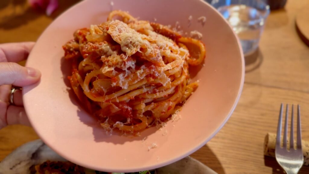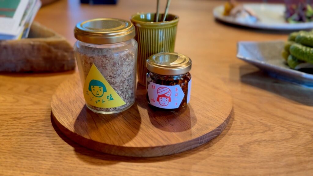 美瑛の酸味の強いトマトから作られたケチャップ、湯で置きで穴のあいたブカティーニパスタ、旭川のソーセージ、チーズ工房タカラのチーズ。途中からモロッコ胡椒(可愛い入れ物に入ってる)で味変できます。